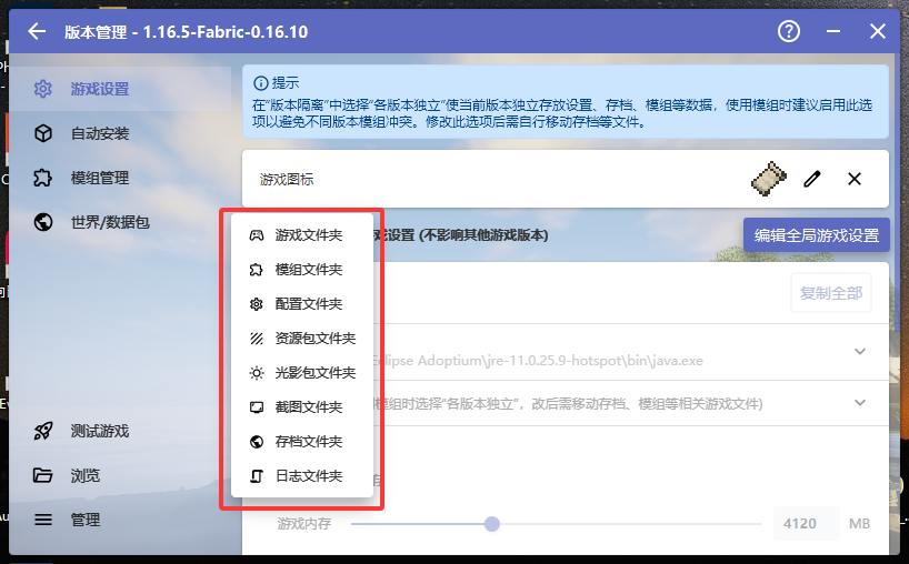 在做完版本隔离的设置后,hmcl 的快速打开各个游戏文件夹的功能就会显得十分好用。